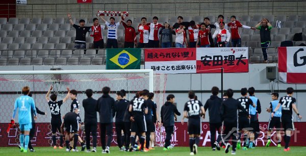 17일 서울월드컵경기장에서 열린 2017 KEB 하나은행 FA컵 16강전 FC서울과 부산아이파크의 경기에서 부산아이파크가 승부차기 접전 끝에 8-7로 승리하며 8강에 올랐다. 경기 후 부산아이파크 선수들이 서포터들의 환영을 받고 있다.