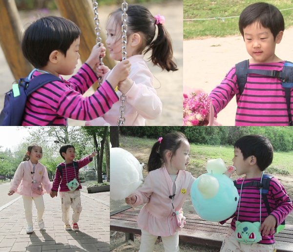 사진 속 서준이는 아름다운 분홍색 꽃다발을 누군가에게 건네고 있는 듯 하다. 또 다른 사진 속 서준이는 예쁜 친구와 있다. 친구의 그네를 밀어주는가 하면, 친구의 손을 꼭 잡고 어딘가를 가리키며 함께 쳐다보고 있는 서준이의 모습이 시선을 사로잡는다. 얼굴보다 더 큰 솜사탕을 들고 먹여주는 두 아이의 귀여운 모습은 보는 이들이 절로 미소를 짓게 만든다.