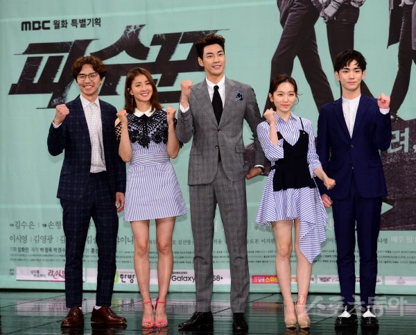 19일 서울 마포구 상암동 MBC 골든마우스홀에서 새 MBC TV 월화드라마 ‘파수꾼’ 제작발표회가 열렸다. 출연 배우들이 포토타임에서 포즈를 취하고 있다. 왼쪽부터 배우 김태훈, 이시영, 김영광, 김슬기, 샤이니 키.