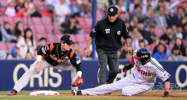 19일 잠실야구장에서 ‘2017 타이어뱅크 KBO 리그’ LG트윈스와 롯데자이언츠의 경기가 열렸다. 2회말 1사 1,2루에서 2루 주자 LG 채은성이 3루 도루를 시도했으나 태그아웃 당하고 있다.