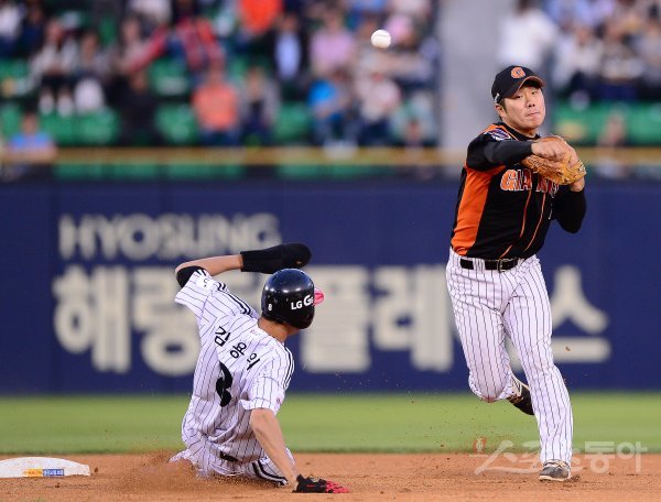 19일 잠실야구장에서 ‘2017 타이어뱅크 KBO 리그’ LG트윈스와 롯데자이언츠의 경기가 열렸다. 3회말 1사 1루에서 롯데 유격수 신본기가 LG 정성훈의 내야 땅볼 때 2루로 향하는 김용의를 포스아웃 시킨 후 1루로 송구하고 있다.
