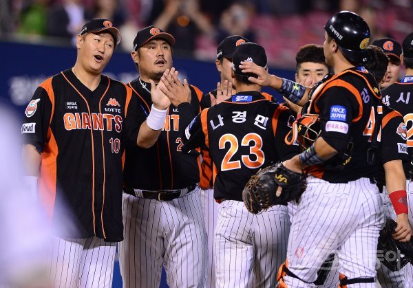 19일 잠실야구장에서 열린 ‘2017 타이어뱅크 KBO 리그’ LG트윈스와 롯데자이언츠의 경기에서 롯데가 9-4로 승리하며 4연승을 질주했다. 경기 후 롯데 이대호가 강민호(오른쪽)와 기쁨을 나누고 있다.