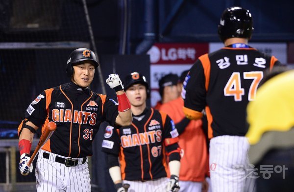 19일 잠실야구장에서 ‘2017 타이어뱅크 KBO 리그’ LG트윈스와 롯데자이언츠의 경기가 열렸다. 8회초 1사 2,3루에서 롯데 강민호가 LG 정찬헌을 상대로 스리런 홈런을 친 후 손아섭(왼쪽)의 축하를 받고 있다.