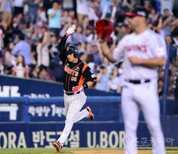19일 잠실야구장에서 ‘2017 타이어뱅크 KBO 리그’ LG트윈스와 롯데자이언츠의 경기가 열렸다. 4회초 1사 1,2루에서 롯데 번즈가 LG 선발 허프를 상대로 스리런 홈런을 치고 세리머니를 하며 그라운드를 돌고 있다. 잠실 | 김진환 기자 kwangshin00@donga.com