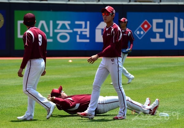 21일 경기도 수원 kt위즈파크에서 ‘2017 타이어뱅크 KBO리그’ kt 위즈와 넥센 히어로즈의 경기가 열린다. 경기전 넥센 홍원기 코치가 선수들이 보는 앞에서 스트레칭 훈련을 하고 있다.