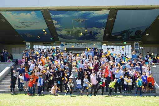 지난해 열린 ‘코리아컵 항공우주과학 경진대회’에서 참가자들이 종이비행기를 날리며 기념 촬영을 하고 있다.사진제공 l 한국항공소년단