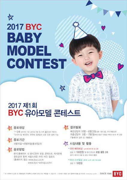 BYC가 6월20일까지 ‘제1회 유아모델 콘테스트’를 연다. 유아 모델을 통해 ‘라미’ 등 유·소아 브랜드의 사랑스럽고 포근한 이미지를 전하고자 마련했다. 1∼3세 유아가 응모 대상으로, BYC이숍 유아모델 콘테스트 게시판에 응모글을 올리면 된다. ‘라미 베이비상’ 수상자에게 상금 각 100만원과 BYC 모델 및 광고 이미지 촬영 기회가 주어진다.