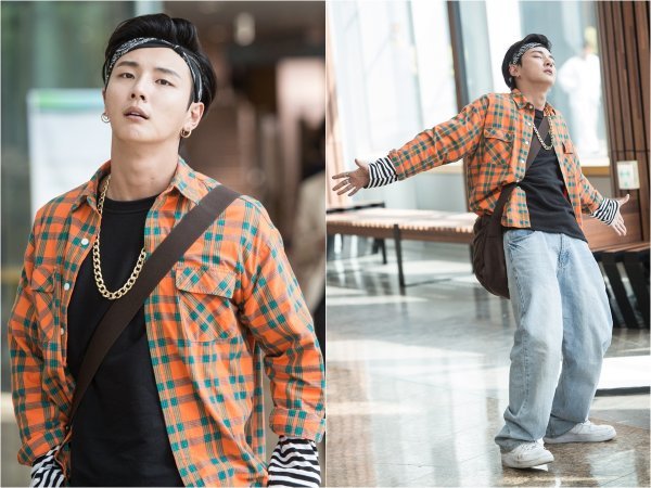 이 가운데 공개된 사진은 복고아이템으로 무장한 윤시윤의 모습을 담았다. 주황색과 청록색이 어우러진 촌스러운 체크남방과 자유롭기 그지 없는 벙벙한 힙합바지를 입고 이에 어울리지 않는 고동색 크로스백을 메고 있다. 뿐만 아니라 윤시윤이 착용하고 있는 헤어 밴드와 볼드한 금 귀걸이, 금으로 된 체인 목걸이 등 시대를 역행하는 듯한 액세서리가 시선을 사로잡는다.