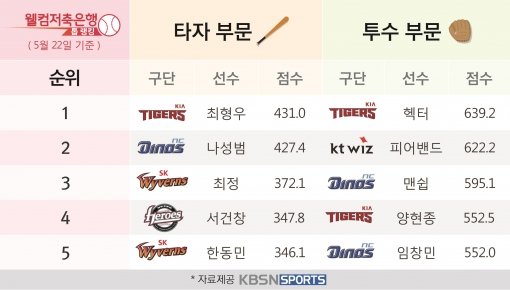 현재 ‘웰컴저축은행 톱랭킹 차트’에는 종합(누적) 랭킹 타자 1위로 KIA 최형우(431.0), 투수 1위로 KIA 헥터(639.2)가 올라있다.