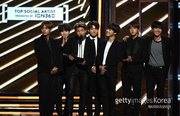 그룹 방탄소년단이 22일(한국시간) 열린 ‘2017 빌보드 뮤직 어워드’에서 케이팝 그룹 최초로 ‘톱 소셜 아티스트’ 부문을 수상하고 소감을 말하고 있다. 사진=ⓒGettyimages이매진스