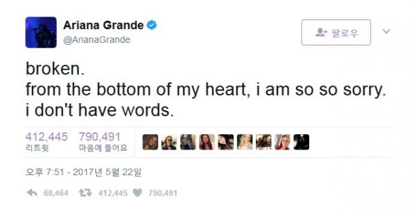 이런 가운데 아리나아 그란데는 22일 자신의 트위터에 “가슴이 찢어진다. 너무나 죄송하다. 뭐라고 드릴 말씀이 없다.(broken. from the bottom of my heart, i am so so sorry. i don\'t have words.)”라는 글을 남겨 이번 테러에 대한 심경을 전했다.