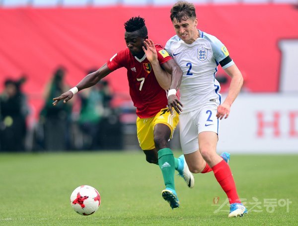 23일 전주월드컵경기장에서 ‘2017 FIFA U-20 월드컵’ 잉글랜드와 기니의 A조 예선 경기가 열렸다. 잉글랜드 존조 케니(2)가 기니 다우다 카마라(7)와 볼다툼을 벌이고 있다.