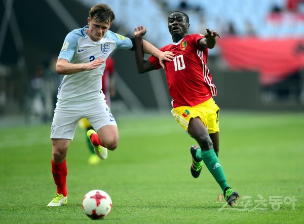 23일 전주월드컵경기장에서 ‘2017 FIFA U-20 월드컵’ 잉글랜드와 기니의 A조 예선 경기가 열렸다. 기니 모를라예 실라(10)와 잉글랜드 케일럼 알렉산더 코널리(3)가 볼다툼을 벌이고 있다.