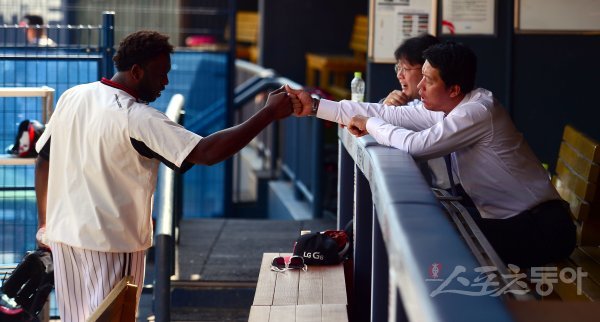24일 서울 잠실야구장에서 열릴 ‘2017 타이어뱅크 KBO 리그’ 두산베어스와 LG트윈스의 경기 전 LG 소사와 이병규 해설위원이 인사를 나누고 있다.