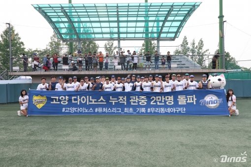고양 다이노스(NC 다이노스 퓨처스팀)가 한국 프로야구 최초로 퓨처스리그 누적 유료관중 2만명을 돌파했다. 28일 고양 야구장에서 열린 두산과의 홈경기에서다. 2015년 경기도 고양시에 자리 잡은 지 3년 만이다.