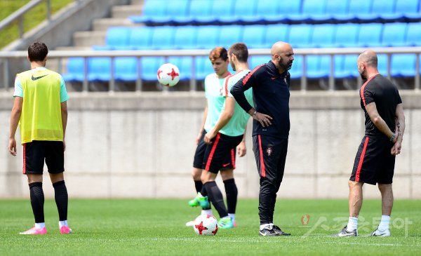 포르투칼 U-20 축구대표팀이 29일 천안 축구센터에서 ‘2017 FIFA U-20 월드컵’ 한국과의 16강 경기를 앞두고 훈련을 가졌다. 포르투칼 에밀리우 페이시 감독이 코치와 이야기를 나누고 있다.