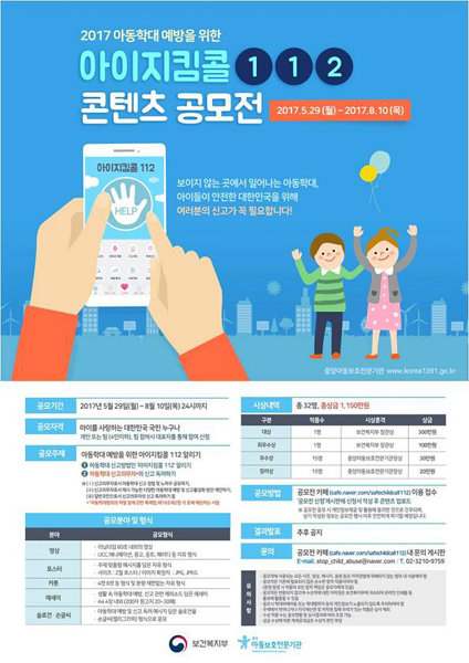 보건복지부는 아동학대신고 활성화를 위한 ‘제3회 아이지킴콜 112 콘텐츠 공모전’(사진)을 진행한다. 이번 공모전은 통합운영 중인 아동학대 의심신고 전화번호 ‘아이지킴콜 112’를 알릴 수 있는 콘텐츠라면 형식에 구애받지 않고 누구나 참여할 수 있다. 영상, 포스터, 카툰, 에세이, 슬로건(손글씨) 5개 분야다. 5월29일∼8월10일까지 접수한다. 참여방법은 참가신청서와 규정에 맞는 참가작품 파일을 공모전 카페를 통해 제출하면 된다. 8월 말경 수상작을 선정 발표하며, 대상 1작품(300만원, 보건복지부장관상)을 비롯해 최우수상 1작품(100만원), 우수상 15작품(30만원), 장려상 15작품(20만원) 등 총 32편이다. 공모전과 관련한 자세한 내용은 공모전 카페나 아동학대 예방 캠페인 포스트를 참조하면 된다.