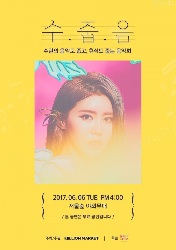 수란의 소속사 밀리언마켓은 수란이 오는 6월 6일 오후 4시, 서울시 성동구에 위치한 서울숲 내 야외무대에서 ‘수란의 음악도 줍고, 휴식도 줍는 음악회(이하 ‘수.줍.음’)’를 진행한다고 전했다.