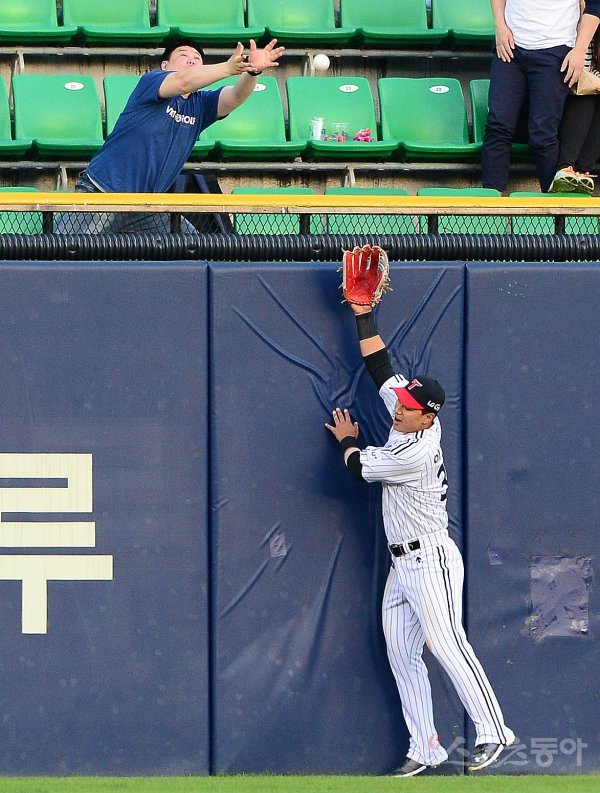 30일 잠실야구장에서 ‘2017 타이어뱅크 KBO리그’ LG트윈스와 넥센히어로즈의 경기가 열렸다. 4회초 LG 좌익수 이천웅이 넥센 선두타자 서건창의 홈런을 잡기 위해 몸을 날리고 있다.