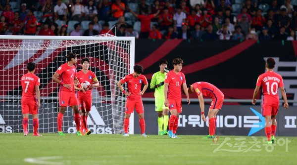 30일 천안종합동장에서 '2017 FIFA U-20 월드컵' 한국과 포르투갈의 16강 경기가 열렸다. 포르투갈에게 실점을 허용한 한국 대표팀 선수들이 아쉬워하고 있다.