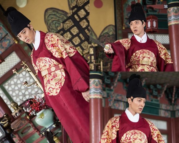 공개된 사진 속 이융은 군주의 위엄을 상징하듯 붉은 용포를 휘날리며 궁의 편전 중심에 서 있다. 누구에게 휘두르기라도 한 듯 그의 손에는 날카로운 칼이 빛을 번쩍이며 들려 있다. 전체적으로 처절한 핏빛을 띤 이융의 모습이 눈을 뗄 수 없게 만든다.