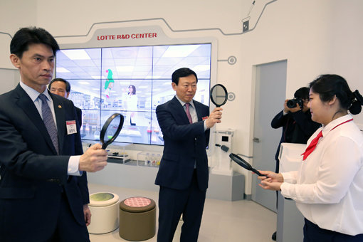 신동빈 롯데 회장(가운데)과 손문기 식품의약품안전처장이 1일 서울 강서구 마곡산업단지에서 열린 ‘롯데 R&D 센터’의 준공식에서 어린이 식품 체험관 ‘스위트빌’을 둘러보고 있다. 사진제공 l 롯데