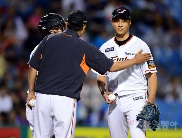 1일 대전 한화생명 이글스파크에서 ‘2017 타이어뱅크 KBO리그’ 한화 이글스와 두산 베어스의 경기가 열렸다. 5회초 무사 1루에서 두산 최주환에게 안타를 허용한 한화 선발 윤규진이 교체되고 있다.