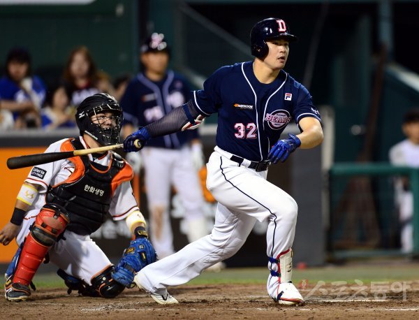 1일 대전 한화생명 이글스파크에서 ‘2017 타이어뱅크 KBO리그’ 한화 이글스와 두산 베어스의 경기가 열렸다. 5회초 무사 1, 3루에서 두산 김재환이 1타점 2루타를 날리고 있다.