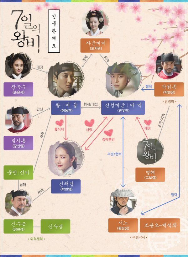 지난 5월31일 KBS 2TV 새 수목드라마 ‘7일의 왕비’(극본 최진영/연출 이정섭/제작 몬스터유니온)가 베일을 벗었다. ‘7일의 왕비’는 방송 첫 주 만에 ‘웰메이드 로맨스사극’이라는 호평을 싹쓸이하고 있다. 이 같은 호평의 중심에는 입체적 캐릭터, 각 캐릭터가 지닌 탄탄한 서사가 있다. 이쯤에서 ‘7일의 왕비’ 인물관계도를 살펴보자. 어떻게 이토록 매력적인 로맨스사극이 탄생했는지 한 눈에 확인할 수 있을 것이다.