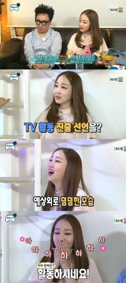 그러나 이내 다정한 남편의 모습을 보이며 아내를 챙겨주는 모습을 보여줬다. 아내에 대한 칭찬도 잊지 않았다. 박명수는 한수민씨의 예능감을 자랑하며 “우리 아내가 끼가 있다. 굉장히 춤도 잘 추고 흥이 넘친다”고 했다.