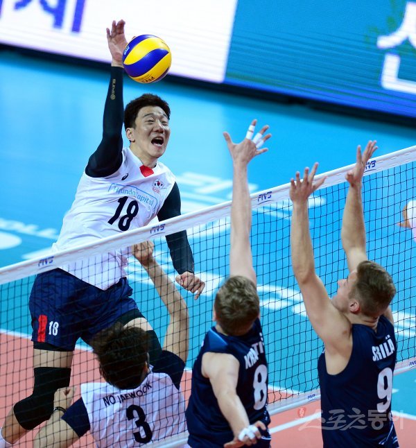 한국 남자배구대표팀이 4일 장충체육관에서 2017 서울 월드리그 국제남자배구대회 핀란드전을 가졌다. 한국 신영석이 핀란드의 블로킹 사이로 스파이크 공격을 하고 있다.