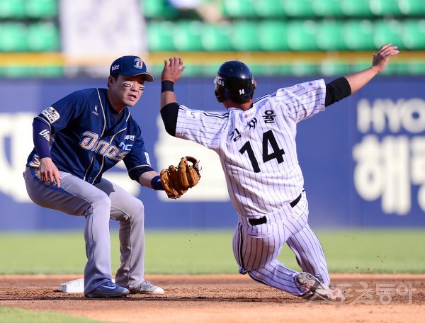 4일 잠실야구장에서 ‘2017 타이어뱅크 KBO 리그’ NC다이노스와 LG트윈스의 경기가 열렸다. 2회말 무사 1루 상황에서 1루주자 LG 김재율이 2루 도루를 시도했으나 아웃되고 있다.