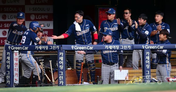 4일 잠실야구장에서 ‘2017 타이어뱅크 KBO 리그’ NC다이노스와 LG트윈스의 경기가 열렸다. 4회초 1사 1,2루 NC 모창민의 역전 1타점 중전 2루타 때 득점한 이종욱이 더그아웃에서 하이파이브 하고 있다.
