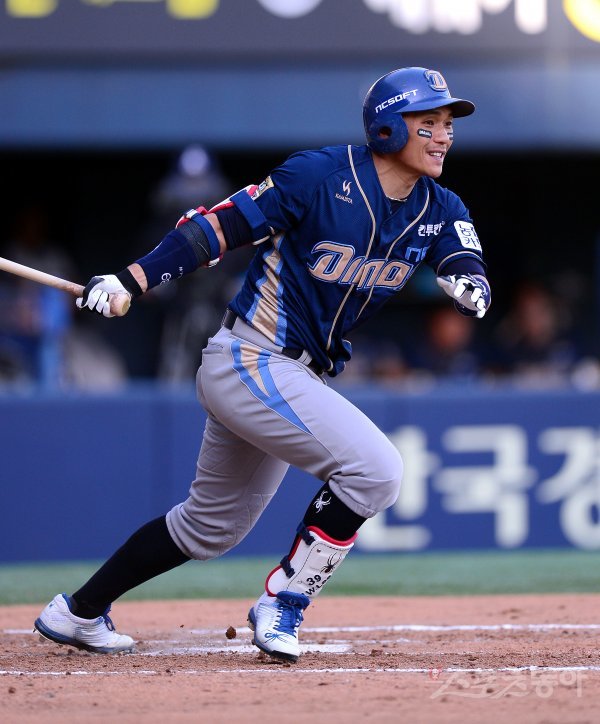 4일 잠실야구장에서 ‘2017 타이어뱅크 KBO 리그’ NC다이노스와 LG트윈스의 경기가 열렸다. 4회초 1사 2루 NC 이종욱이 동점 적시타를 치고 있다.