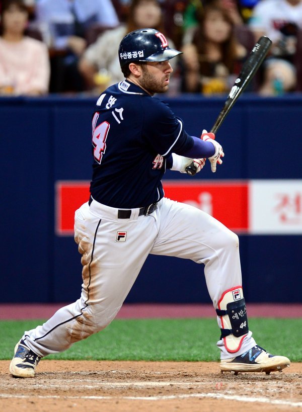 4일 서울 고척스카이돔에서 ‘2017 타이어뱅크 KBO리그’ 넥센 히어로즈와 두산 베어스의 경기가 열렸다. 7회초 2사 2, 3루에서 두산 에반스가 역전 2타점 적시타를 날리고 있다.