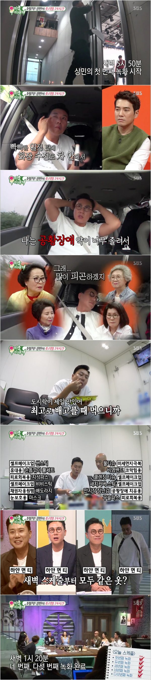 지난 밤(4일) 방송된 ‘미우새’의 최고의 1분은 ‘이상민의 24시간’편이었다. 요즘 예능 대세로 떠오른 이상민은 새벽 3시 30분에 일어나 하루종일 5개의 스케줄을 소화한 뒤 새벽 2시에 집에 도착하는 일정을 소화했다. 스타일리스트가 없는 이상민은 모든 옷과 의상, 헤어와 메이크업을 스스로 해결했다. 이어 ‘공황장애 약 때문에 졸음이 쏟아진다.’며 커피 4리터를 들고나서 수시로 커피를 마시는 모습으로 어머님들의 안타까움을 자아냈다. 제대로 밥 먹을 시간도 없이 종횡무진하며 방송가를 쫓아 다니는 이상민의 모습에 어머님들도 응원을 보냈다. 새벽 4시에 나온 이상민이 스케줄 3개를 소화한 뒤, 오후 2시가 넘어서야 한숨을 돌리며 도시락을 먹으며 “도시락이 제일 맛있다. 최고로 배고플 때 먹으니까”라는 말을 남겼고, 해당 장면은 26.6%까지 치솟으며 이번 주 최고의 1분을 기록했다.