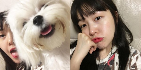 민아는 4일 인스타그램에 자신의 사진 두 장을 게재했다. 사진 속 민아는 화장기 없는 수수한 얼굴로 카메라를 응시하고 있다. 특히 강아지를 옆에 두고 찍은 사진에서는 처진 눈과 살짝 벌어진 입이 싱크로율 100%를 자랑한다.