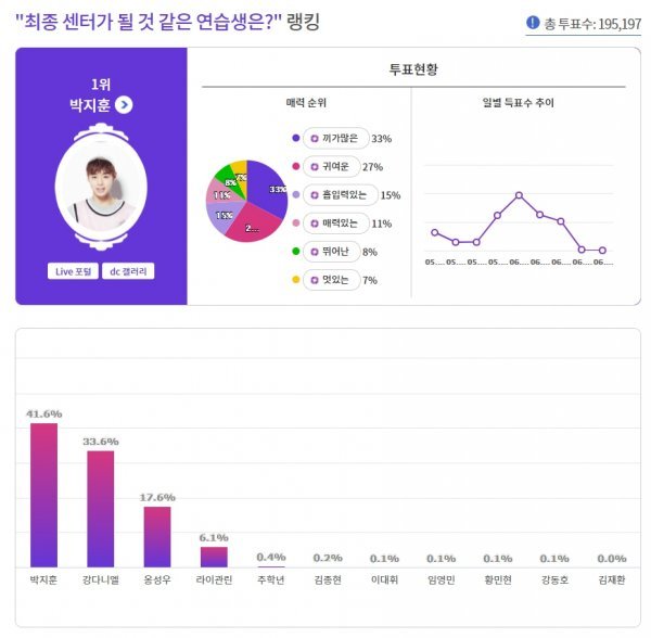 국내 대형 커뮤니티와 취향 검색 기업이 운영 중인 익사이팅디시가 '최종 센터가 될 것 같은 연습생은?'으로 투표를 실시한 결과 박지훈이 1위에 올랐다. 이 투표는 지난 5월 28일부터 6월 3일까지 총 7일간 진행했다.