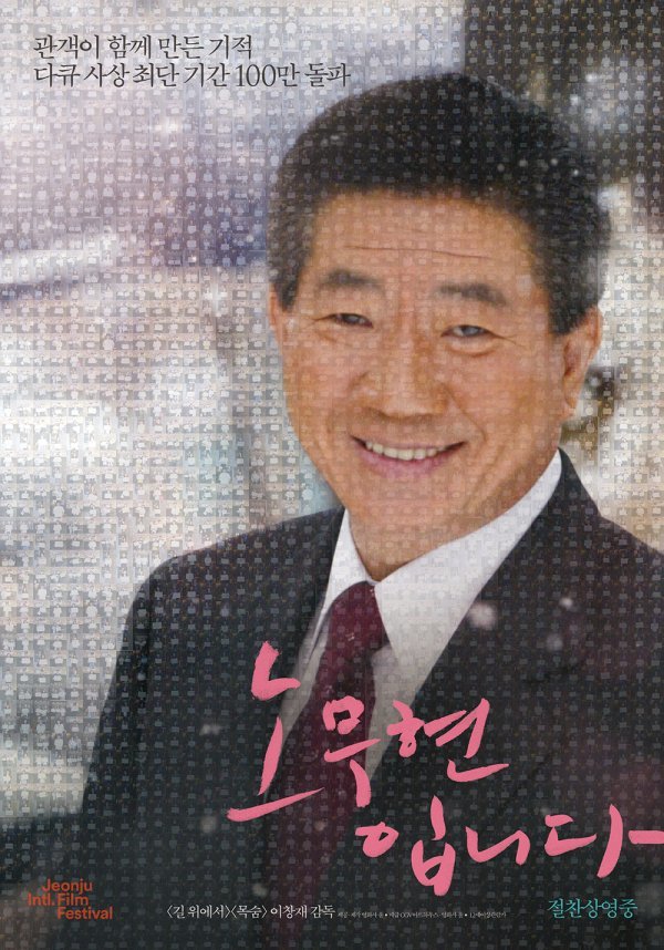 다큐 사상 최단기간 100만 관객 돌파라는 뜨거운 성원을 받은 영화 ‘노무현입니다’가 100만 돌파를 맞아 관객들의 진심이 담긴 리뷰로 완성된 관객 참여 포스터를 공개했다. 이번에 공개된 관객 참여 포스터는 故노무현 전 대통령의 미소 띈 모습이 전국 2000여 명의 관객들이 직접 작성한 리뷰를 들고 찍은 사진들로 완성되어 “관객이 함께 만든 기적”이라는 카피와 어우러지며 그 의미를 더하고 있다. 영화 ‘노무현입니다’에 담긴 2002년 새천년민주당 국민참여 경선 당시 지지율 2%로 출사표를 던진 꼴찌후보 노무현이 시민들의 지지와 성원 속에 대선후보 1위가 되기까지의 드라마틱한 과정을 담은 작품.