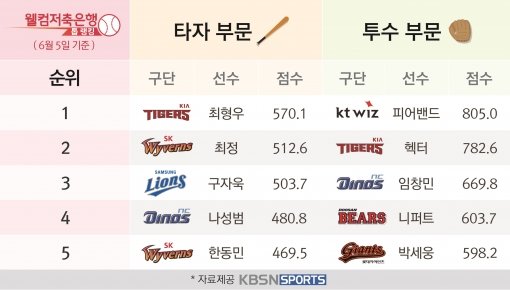KBS N 스포츠가 6월 1주차 2017 KBO리그 ‘웰컴저축은행 톱랭킹’을 5일 발표했다.