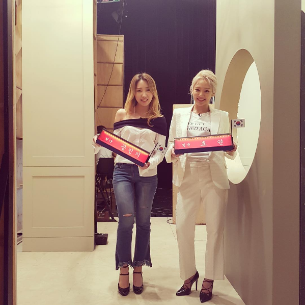 사진 속 공민지와 효연은 촬영장에서 어깨를 나란히 하고 밝은 미소를 짓고 있다. 각각 자신의 이름이 적힌 이름표를 들고 있다. 공민지는 오프숄더 셔츠로 한쪽 어깨를 드러내 성숙한 매력을 뽐냈고, 효연은 ‘올 화이트’ 정장룩과 함께 시크한 분위기를 연출했다.