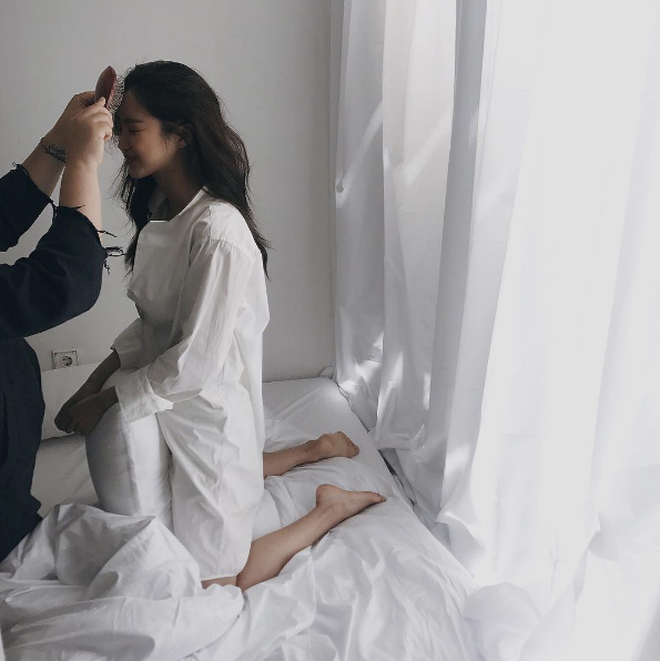 사진 속 손나은은 침대 위에서 흰 셔츠를 입고 청순하면서도 섹시한 매력을 과시하고 있다. 스태프로부터 머리 손질을 받고 있는 손나은은 얼굴을 살짝 찡그리며 귀여운 느낌 또한 자아낸다. 길게 늘어뜨린 검은색 웨이브 머리와 큰 셔츠는 남심을 자극하기에 충분하다.