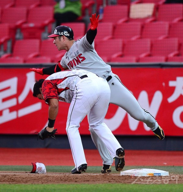 6일 수원 kt위즈파크에서 ‘2017 타이어뱅크 KBO 리그’ LG트윈스와 kt위즈 경기가 열렸다. 2회초 1사 LG 오지환이 내야 땅볼을 치고 1루에서 아웃되고 있다.