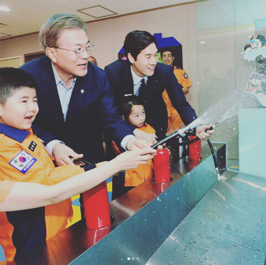 김효진이 공개한 사진에는 문재인 대통령과 유지태가 아이들과 함께 소방교육을 하고 있는 모습이 담겼다. 온화하고 밝은 두 사람의 표정이 시선을 사로 잡는다.