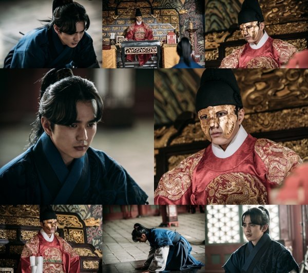 이와 관련 유승호와 엘(김명수)이 5년 만에 다시 만나게 된, 의미심장한 대면 현장이 포착돼 이목을 집중시키고 있다. 극중 가면을 쓴 채 옥좌에 앉아있는 이선 앞에 보부상 두령 신분의 세자가 무릎 꿇고 엎드린 채 있는 장면. 더욱이 두 사람은 그동안의 고난과 역경을 떠올리는 듯 연인보다 더 처연한 눈빛으로 서로를 바라보며 진심을 나누고 있다. 과연 ‘극과 극’ 운명이 뒤바뀐 채로 재회하게 된 두 사람이 어떤 대화를 나누게 될지, 어떤 내용들이 밝혀질 지 궁금증이 모아지고 있다.
