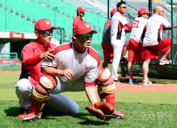 8일 인천 SK행복드림구장에서 ‘2017 타이어뱅크 KBO리그’ SK 와이번스와 넥센 히어로즈의 경기가 열린다. 경기전 SK 박경완 코치가 이홍구를 밀착 지도하고 있다.