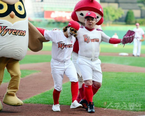 8일 인천 SK행복드림구장에서 ‘2017 타이어뱅크 KBO리그’ SK 와이번스와 넥센 히어로즈의 경기가 열렸다. 종편방송 ‘최고의 사랑’에 출연중인 김숙과 윤정수가 시타와 시구를 맡아 코믹한 장면을 연출하고 있다.