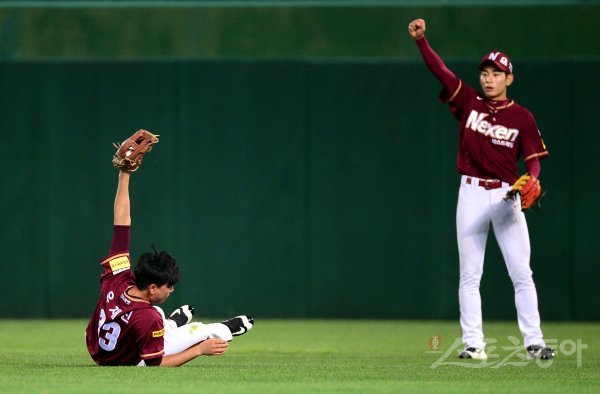 8일 인천 SK행복드림구장에서 ‘2017 타이어뱅크 KBO리그’ SK 와이번스와 넥센 히어로즈의 경기가 열렸다. 8회말 무사에서 SK 김강민의 타구를 넥센 유재신이 다이빙 캐치로 잡아내고 있다.