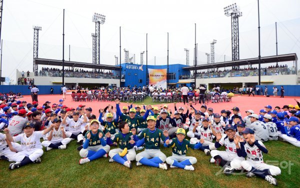 9일 아시아 최대 규모의 유소년 야구장 ‘화성드림파크’에서 열린 개장식에 참석한 리틀야구 선수들이 카메라를 향해 포즈를 취하고 있다. 화성시 매향리 일대에 리틀야구장 4면, 주니어야구장 3면, 여성야구장 1면 총 8면으로 총 767억 원의 사업비가 투입됐다.