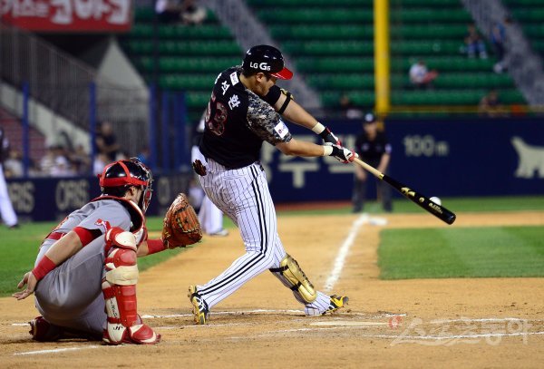 11일 잠실야구장에서 ‘2017 타이어뱅크 KBO 리그’ SK와이번스와 LG트윈스의 경기가 열렸다. 8회말 2사 3루 LG 양석환이 1타점 적시타를 치고 있다.